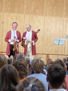 Mit stürmischer Rockmusik startete das Mitmachkonzert der Tonkünstler. Die Musiker reisten 300 Jahre in der Zeit zurück. Zwei Kammerdiener (Schulkinder) halfen den Musikern ihre Barockkostüme anzuziehen. Mit dem Frühling aus den Vier Jahreszeiten von Vivaldi startete die Reise. In jeder Jahreszeit durften die Kinder mittanzen, mitraten, mitklatschen und mitmusizieren. Die Kinder waren so begeistert, dass sie sogar um eine Zugabe baten. Danke für dieses grandiose Musikvergnügen.